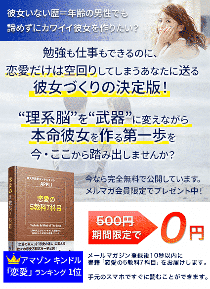 そんな僕らの指導内容をギュッと凝縮したのが「恋愛の5教科7科目」です。ぜひ今すぐに手に入れてください。